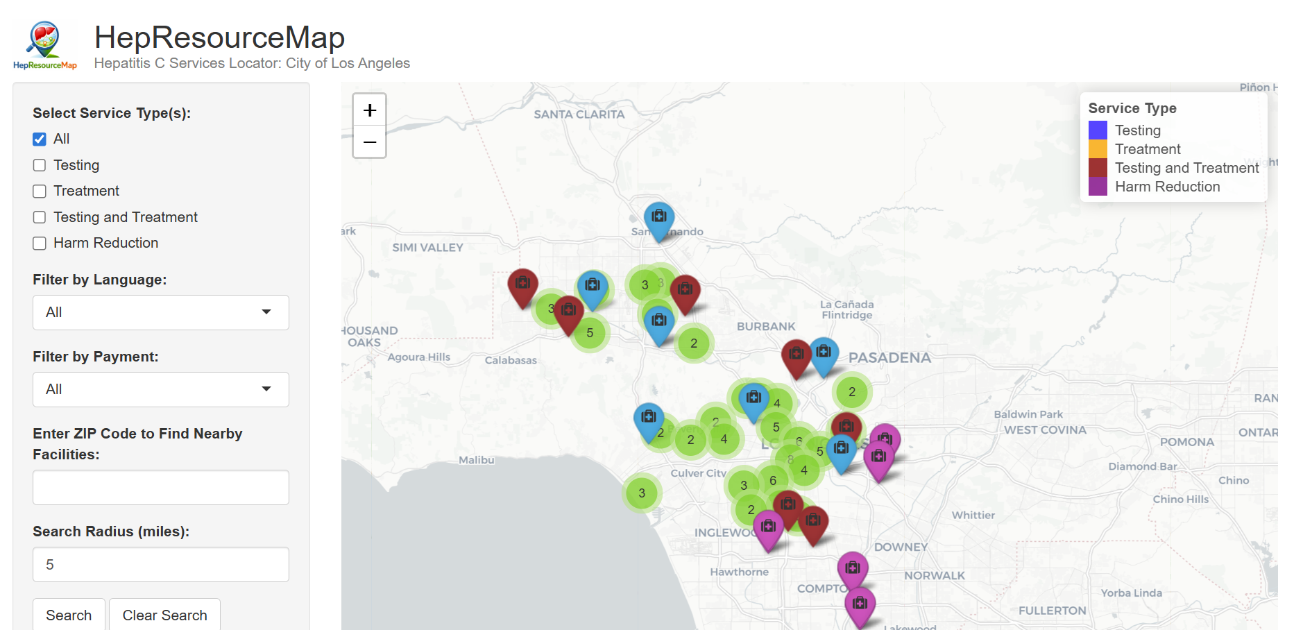 HepResourceMap aims to support residents of the City of Los Angeles and individuals diagnosed with HCV by helping them locate nearby HCV testing and treatment sites, as well as public health agencies, to identify spatial access gaps.